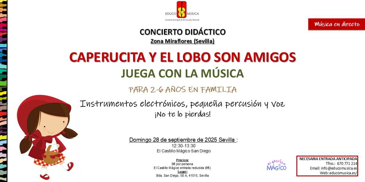 Información y venta de entradas Evento: "Caperucita y el Lobo son amigos" Fecha evento: 28 de septiembre Lugar evento: C.E.I. El Castillo Mágico San Diego Horario: De 12:30 a 13:30 Precios: 6,00€ - 8,00€ Compañía: Educo-Música Procedencia Cía.: Sevilla Texto y música: Educo-Música Género:Para niños de 2 a 6 años y sus familias. var exampleCallback = function() { […]