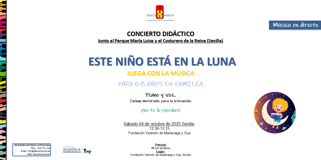Evento: “Concierto didáctico este niño está en la luna” Fecha evento: 04 de octubre Lugar evento: Fundación Valentín de Madariaga y Oya Horario: De 12:30 a 13:15 Precios: 6,00€ – 8,00€ Compañía: Educo-Música Procedencia Cía.: Sevilla Texto y música: Educo-Música Género: Para niños de 0 a 8 años en familia.